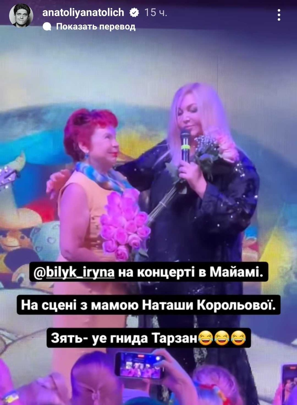 11 августа в Майами состоялся концерт украинской певицы Ирины Билык. В ходе выступления певица увидела в зале маму российской певицы Наташи Королёвой — Людмилу Порывай. Женщина была одета в цвета национального флага Украины. Билык пригласила её выйти на сцену — мать Королёвой согласилась.