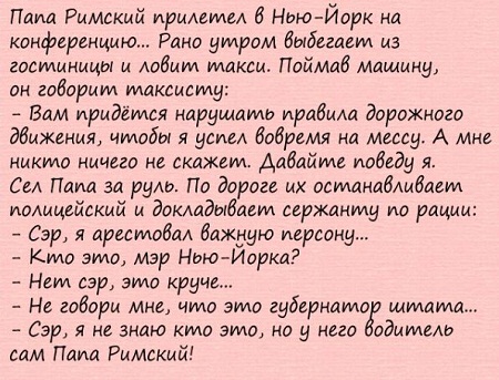 Продолжаем веселить вас, а заодно и веселиться сами. Ведь, читая эти анекдоты, просто невозможно остаться равнодушным. Каждый из них – смешной, остроумный, актуальный. А некоторые из них – и вовсе составлены на самые пикантные темы. Но тем и интереснее – ведь получается, что темы этих анекдотов такие же многогранные, как сама жизнь. А значит, каждый сможет найти здесь для себя то, что рассмешит.