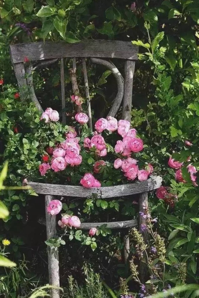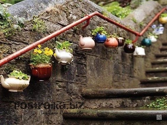 Вы только взгляните на эти фото оформления: цветы здесь посажены в горшки, а они, в свою очередь, размещены на заборе, стене, окне, вмонтированы в старую мебель, подвешены, поставлены, установлены в самые непредсказуемые и интересные места. Нет никаких ограничений, любую часть территории можно оформить таким впечатляющим образом!