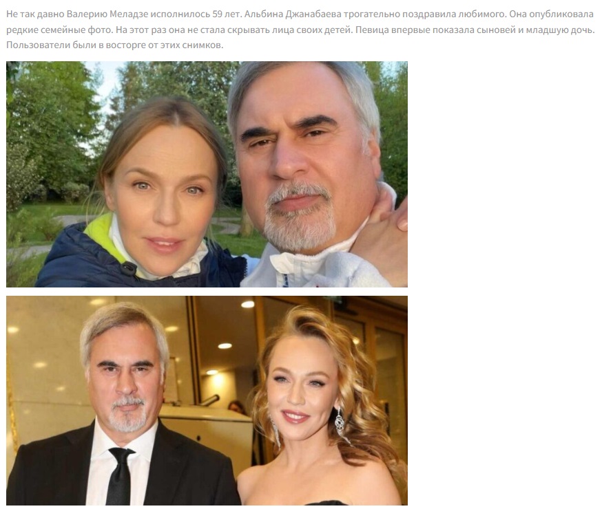 Недавно экс-виагра Альбина Джанабаева решила публично поздравить супруга с 59-м днем рождения. По такому случаю она впервые опубликовала у себя в соцсетях лица всех троих детей Валерия Меладзе. Вот только подписчиков смутило, что ни один ребенок не похож на папу. Видимо, гены Альбины оказались сильнее…