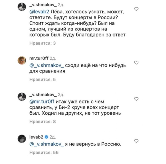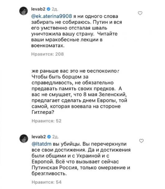 «Вы – убийцы. Вы перечеркнули все свои достижения. Да и достижения были общими с Украиной и Европой. Все, что вызывает сейчас путинская Россия, только омерзение и брезгливость […]. Я ни одного слова забирать не собираюсь. Путин и вся его умственно отсталая шваль уничтожила нашу страну. Читайте ваши «мракобесные» лекции в военкомате», — написал Лева Би-2.