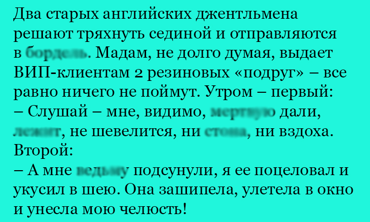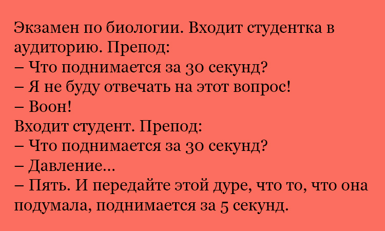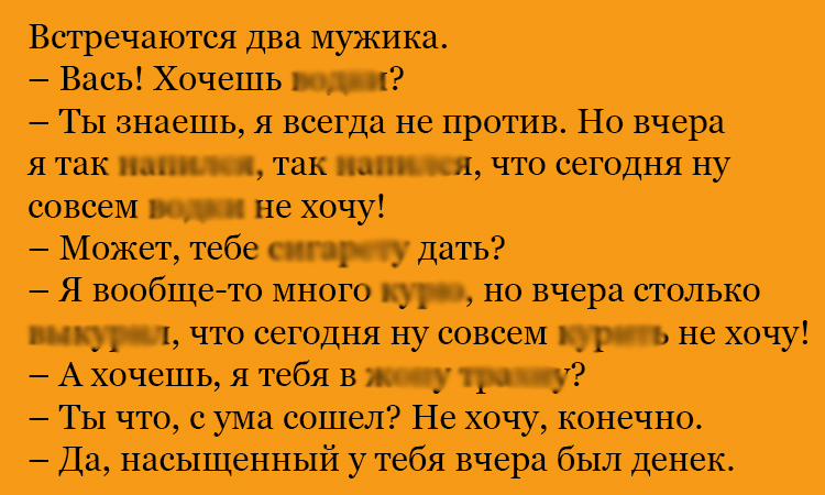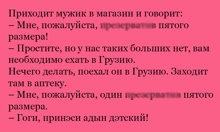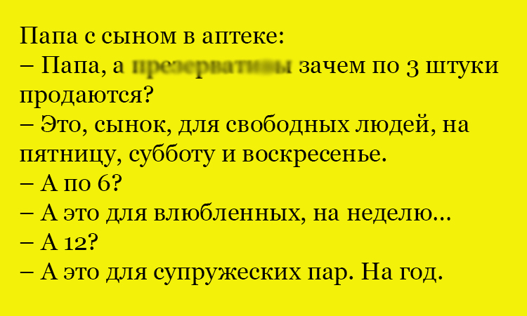 Миленькие шуточки про детские перлы, фотографии нашаливших домашних любимцев и картинки с нелепо одетыми людьми — это конечно забавно и улыбки вызывает, но давайте быть честными — именно «взрослые анекдоты», построенные на отношениях между мужчинами и женщинами, с добавлением пикантных и острых ситуаций заставляют нас действительно хохотать! А почему бы и нет? Если Вам уже есть 18 лет, и Вы готовы к настоящему веселью — новенькая порция откровенного юмора ждет Вас.