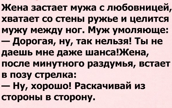 О чем бы мы не говорили, о чем бы не шутили, а самым важным фактором в жизни каждого из нас так или иначе являются отношения с противоположным полом, будь то официальный спутник жизни или просто человек, к которому испытываешь симпатию. И естественно, ситуации, которые возникают между мужчинами и женщинами порождают массу ярких и невероятно смешных анекдотов, среди которых есть и довольно пикантные.