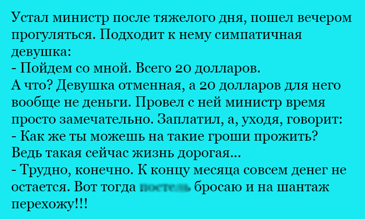 Все на свете имеет свою цену, и если кажется, что что-то стоит слишком дёшево, значит Вы просто чего-то не учли. Именно это случилось с министром — героем нашего первого анекдота — он решил, что ему оказывают услугу за слишком скромную плату, не осознавая, какой сюрприз его ждет впереди…