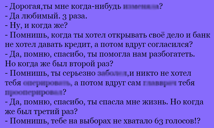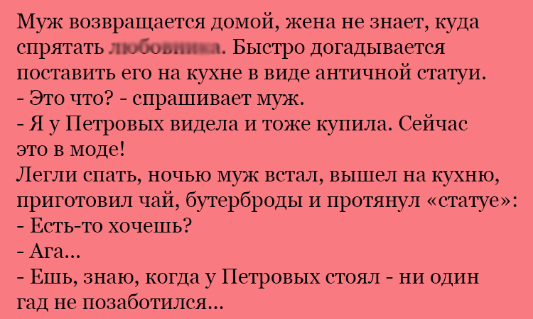 Казалось бы верность — понятие абсолютное, но это так только кажется. Порой, супруги могут совершать такие поступки ради своих половинок, которые не очень вписываются в картинку здравого смысла. Но на то они и анекдоты…