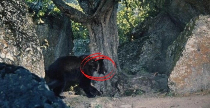 По лесу гуляет медведь. Дикое страшное животное, в диком и страшном лесу. Только медведь в ошейнике. А за деревом, наверное, прячется его дрессировщик.