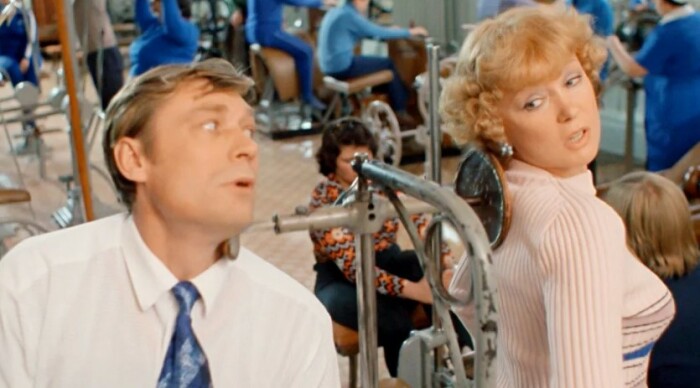 То она вбегает на работу в брюках, а потом через доли секунды забегает в кабинет начальницы в юбке. То сама Людмила Прокофьевна меняет положение очков, зажатых в руке, во время одного и того же разговора, при этом не меняя положения тела. Чудеса да и только!