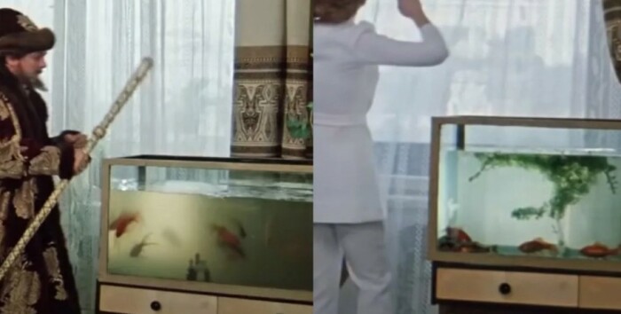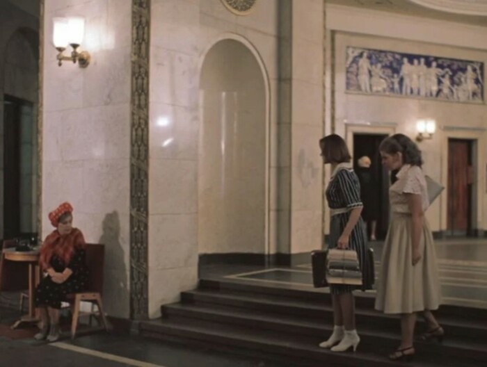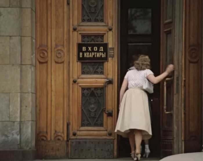 Ну и что в этом такого? В ту пору во многих квартирах был практически идентичный интерьер и никого это не смущало. А вот другие детали действительно ляпы чистой воды. Вот Людмила входит вслед за Катериной в дом, на ней светлые босоножки. А затем, в парадной она стоит уже в черных босножках.