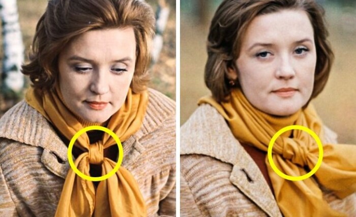 Еще особо внимательные замечают, что желтый шарфик Катерины повязан по-разному во время пикника. Ну а что мешало бы обычной женщине, в обычной женщине перевязать его, освежив узелок? А вот сумку она во время первого разговора с Гошей она не трогает, тем не менее, она перемещается с места на место, да еще и меняет содержимое.