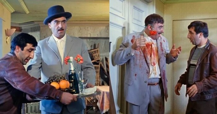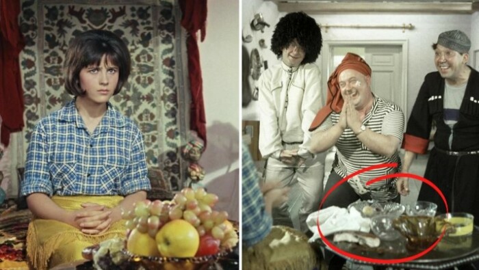 Еще один любимый советскими зрителями фильм, который не лишен некоторых нюансов. Например, товарищ Саахов собирается зайти в комнату к девушке (Наталье Варлей)с подносом, но та выгоняет его, облив вином. Правда вина на подносе, с которым он вошел не было.