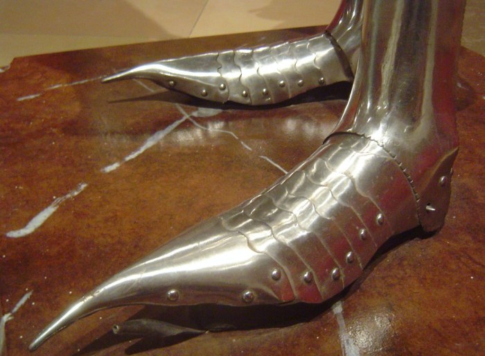 Дошла мода на пулены и до рыцарского сословия, до военного дела. В XV веке доспехи миланского и готического типа оснащались саботинами – металлическими пуленами. Никакого функционального смысла у таких длинных носков из металла не было, просто дань тогдашней актуальной моде. На самом деле саботины были обычными рыцарскими ботинками. Причудливый носок крепился поверх сапога уже после того, как рыцарь залезал на коня и снимался его слугами перед тем, как он слазил на землю.