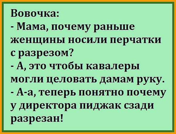 Для того, чтоб провести приятный вечер нужен вкусный ужин, немного покоя и порция яркого юмора, которая подарит заряд позитива и бодрости. Именно поэтому мы, как всегда, собрали для Вас свеженькие е и действительно смешные анекдоты и шуточки — чтоб Ваше настроение было на максимуме. А с чудесным настроением Вам прекрасный вечер гарантирован. Именно этого мы Вам и желаем!
