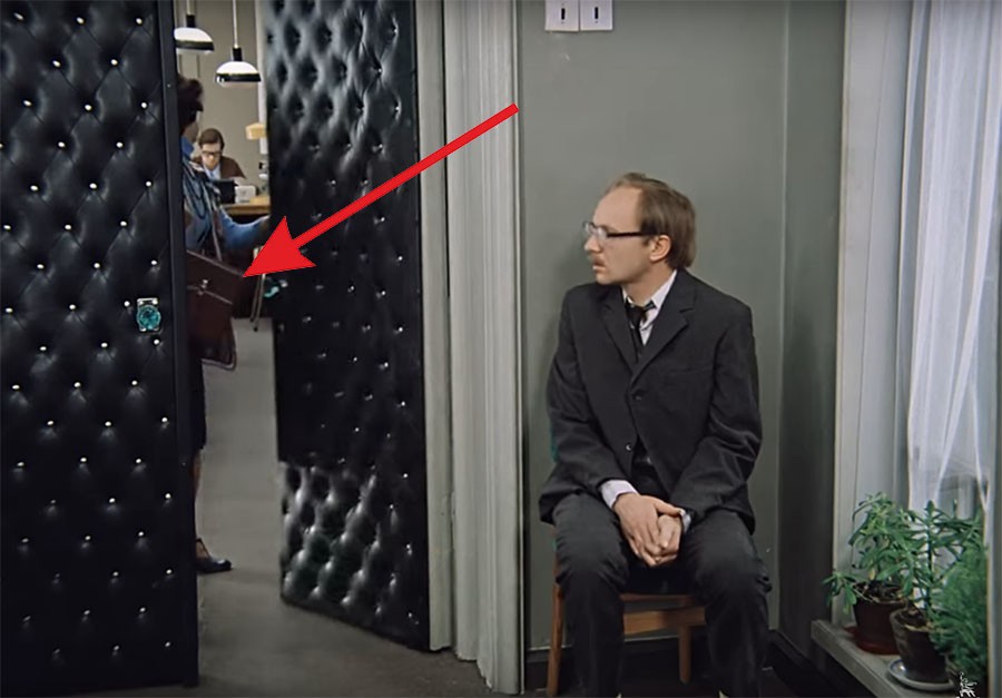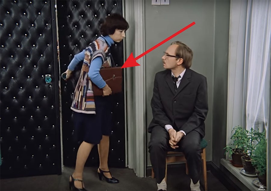 Но при смене ракурса видно, что никакой папки у неё в руках нет (как нет её и на столе, она не положила её при входе).