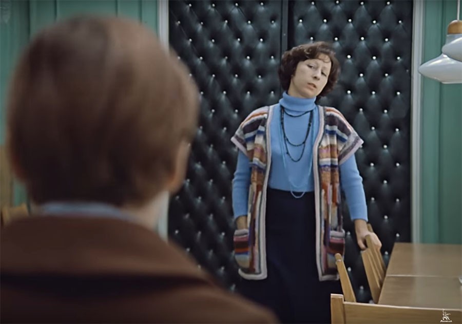Следующий эпизод. Беседа Людмилы Прокофьевны с Новосельцевым. Она, сразу видно, сильно нервничала при нём. Потому как её пиджак то растёгнут на распашку.