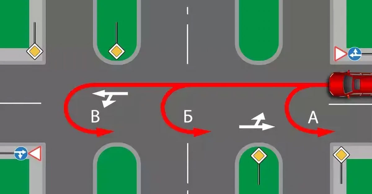 Специально для этого мы предлагаем вам решить коротенькую задачку на знание ПДД. Итак, если вы готовы, то взгляните на эту картинку и ответьте на вопрос — по какой из заданных траекторий может развернуться красный автомобиль. Только не слишком спешите с ответом, ведь вопрос, на самом деле, очень даже каверзный.