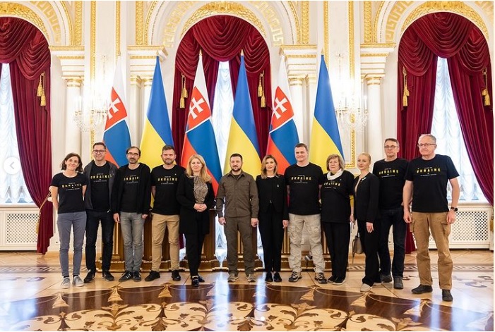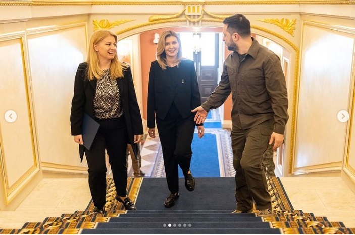 Первая леди Украины Елена Зеленская в соцсетях показала первые совместные снимки с мужем после начала войны в Украине. Фото были сделаны во время официальной встречи супругов с президентом Словакии Зузаной Чапутовой.