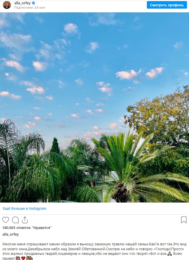 «Это вид из моего окна. Декабрьское небо над Землей Обетованной. Смотрю на небо и говорю: «Господи! Прости этих жалких продажных твaрей, лицемеров и лжецов, ибо не ведают они, что творят». Вот и все», – добавила артистка.