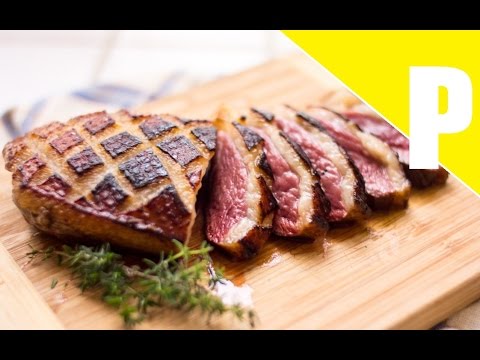 Обжаренную утиную грудку снять со сковороды и дать отдохнуть в течение 5 минут в тёплом месте, затем нарезать тонкими ломтиками вдоль надрезов на коже и сразу же подавать.