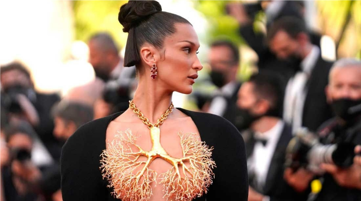 По задумке дизайнера золотые бронхи на груди модели стали символом победы людей над болезнями. Свой образ Белла дополнила высокой прической в духе нулевых, лаконичными черными босоножками на высокой шпильке, крупными серьгами и кольцом с рубинами, а также ярким, вечерним макияжем. Хадид уже дважды обратила на себя внимание с начала кинофестиваля 2021.